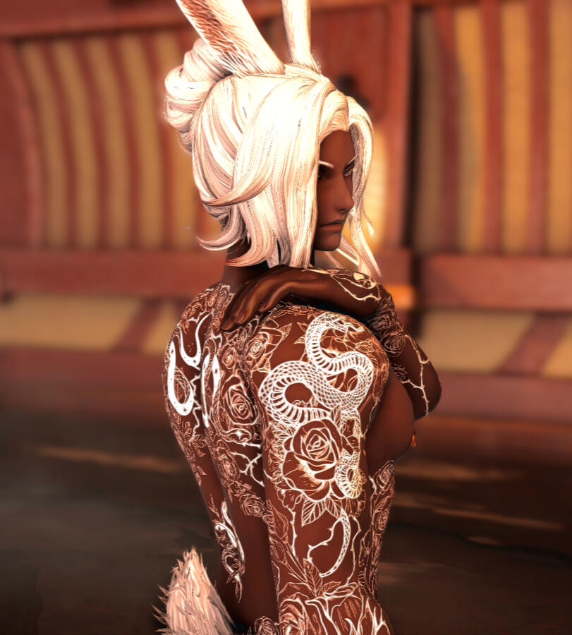 For those who know the underground, especially in Ul'dah, you may recognize the viper and lily upon the small of his back. It is, in truth, a brand that was tattooed over. One reason it is different than the rest of the body tatoo. This symbol is the emblem of Viper Lily, a infamous brothel, and underground slave trade. That also deals in shipping drugs, and other illicit items.